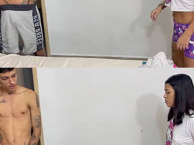 Mi tímida hermanastra me sorprende masturbándome con su ropa inward y me la follo duro hasta corre