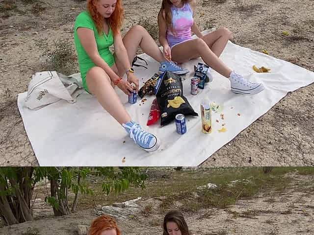 Trashy Picnic on Field. Two Girls Pantyless Having Fun