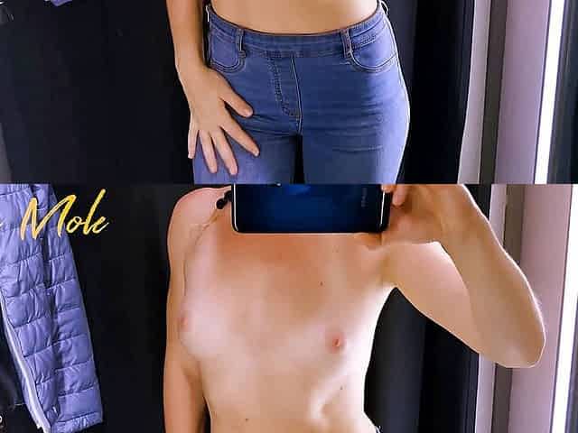 A girl with a perfect figure in jeans, shows her small beautiful breasts