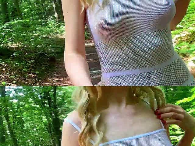Kinky blonde have a risky run in see through dress flashing tits and pussy in public while exercising