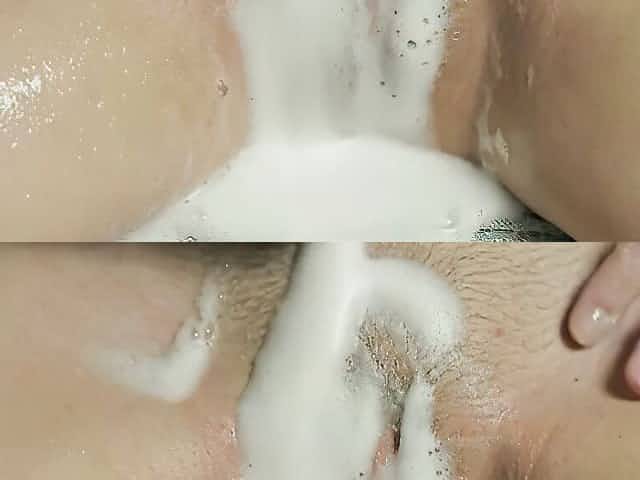 Solo darling is rubbing and washing her natural tits and delicious pussy