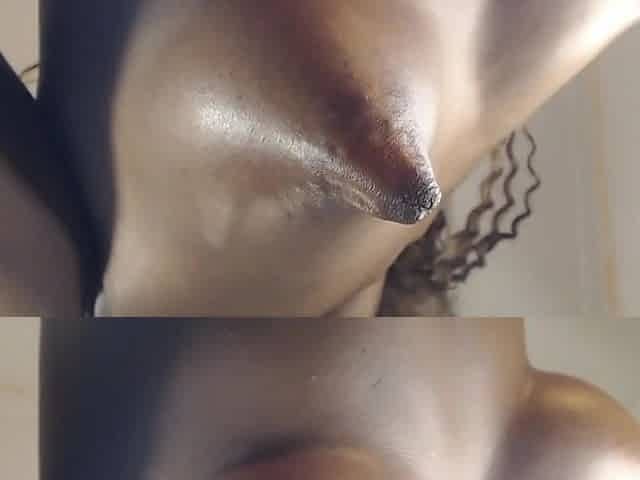 Ebony girl with puffy hard nipples spreads her hole and shows pink toy