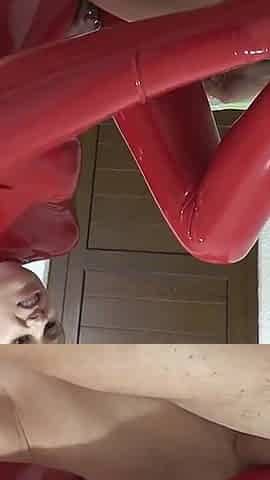Hot Babe in Red Latex Jumpsuit Pumps Big Guys Cock