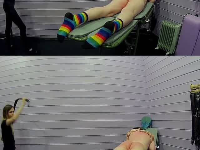 Bound submissive endures intense belt smacking in a BDSM punishment session