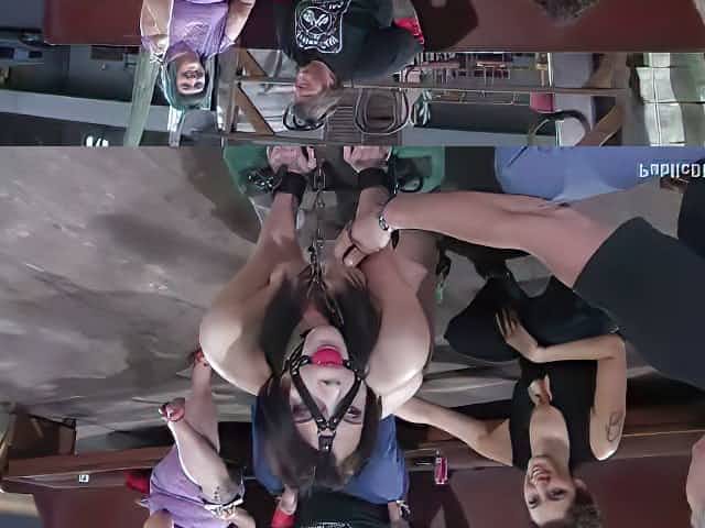 Tied up and suspended chick is punished in public