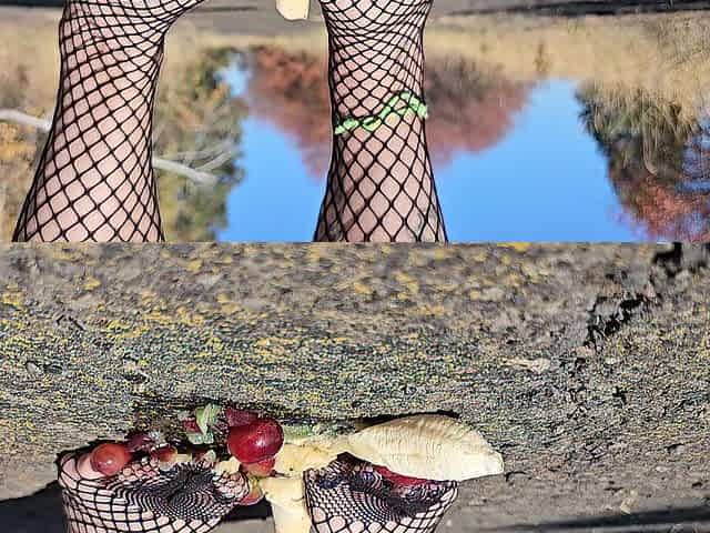 Punk cutie crushing fruit in fishnet clad feet