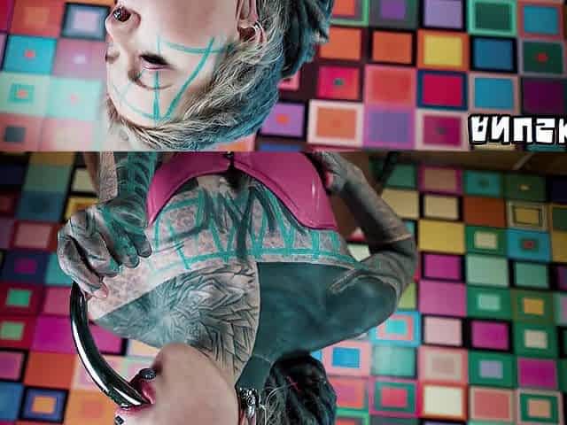 Tattooed Punk Angel unfathomable screwing unshaved cunt with sex toy and tastes her cum