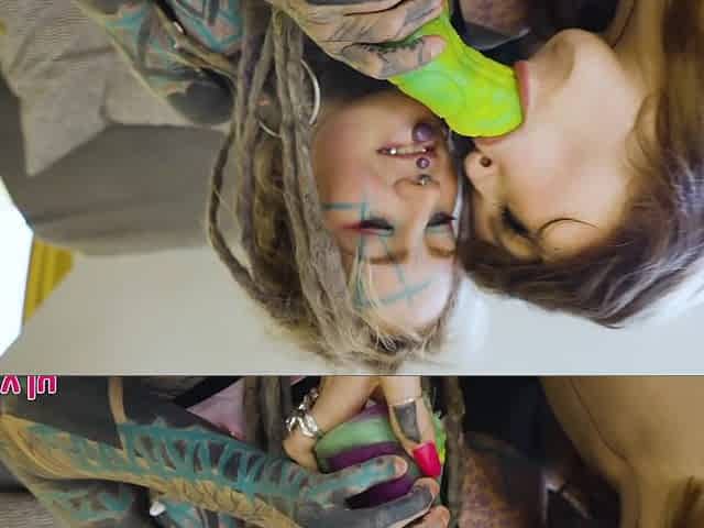 "ALt punk girls Anuskatzz and Eden share a tattooed cock"