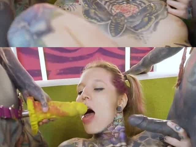 Inked punk girl is fucked by two horny stallions in 3some