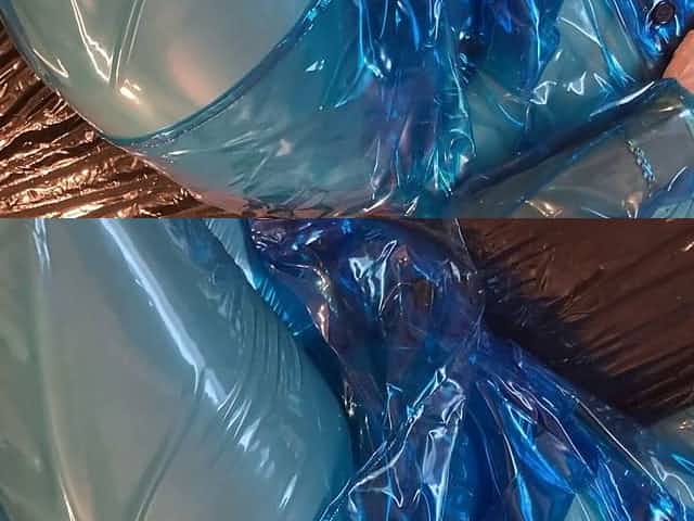 Latex gloved oiled up in transparent raincoat giving oral and screwing untill creampie