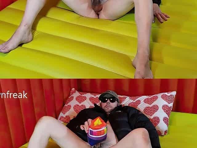 Down Jacket Wearing Fetish Stud Pleasures Himself With Inflatable Water Wing on Daybed of Air Mattresses