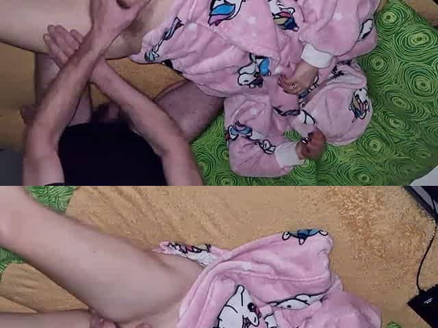 Stepson caught masturbating by stepmom in the bathroom, gets help to cum quickly on her pussy while her husband is home