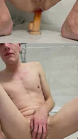 groaning and roughly riding a large sex toy