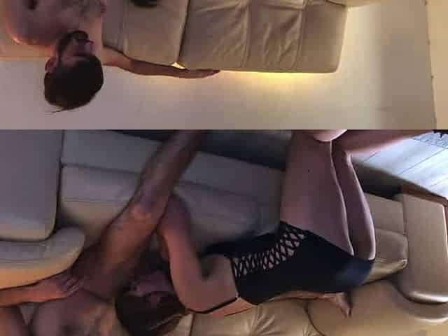 Tattooed Brunette Sucks and Rides Lover's Cock on the Couch