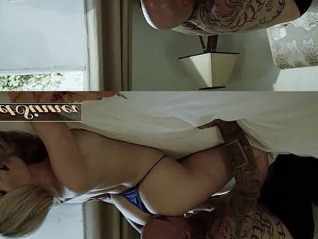 Tattooed girl gets fucked by a stranger and gags on his cock