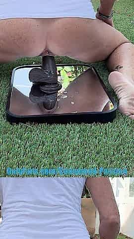 Riding and squirting on a mirror outside on the terrace