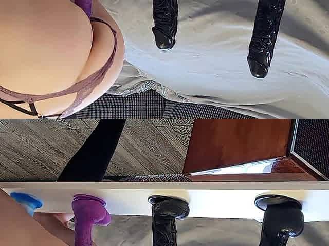 Girls riding a dildo in split screen