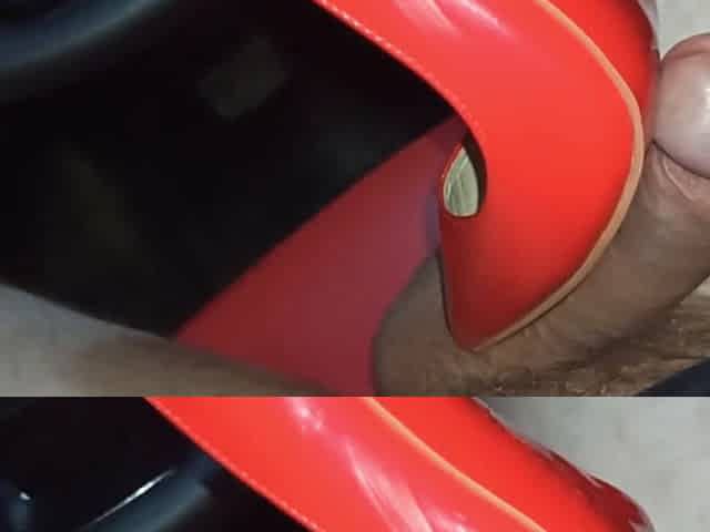 Red High Heels Footjob with Double Cumshotd