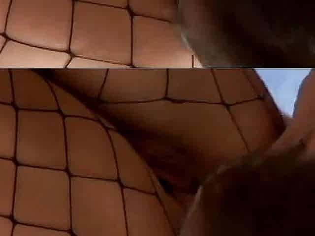 Brunette nymph in fishnets sucks meaty dick while getting her round ass fucked