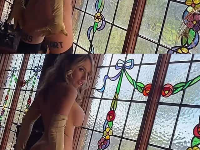 Fantastic booty Vikki riding on toy wang in very constricted costume