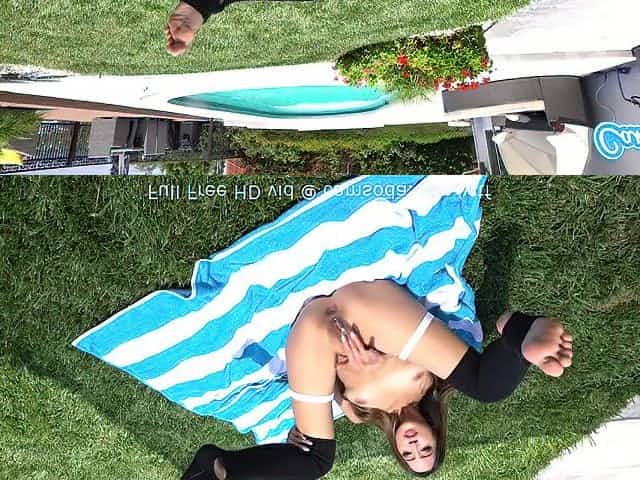 Beautiful amateur brunette Tess Lyndon tans outdoors while she rubs her soaking wet pussy