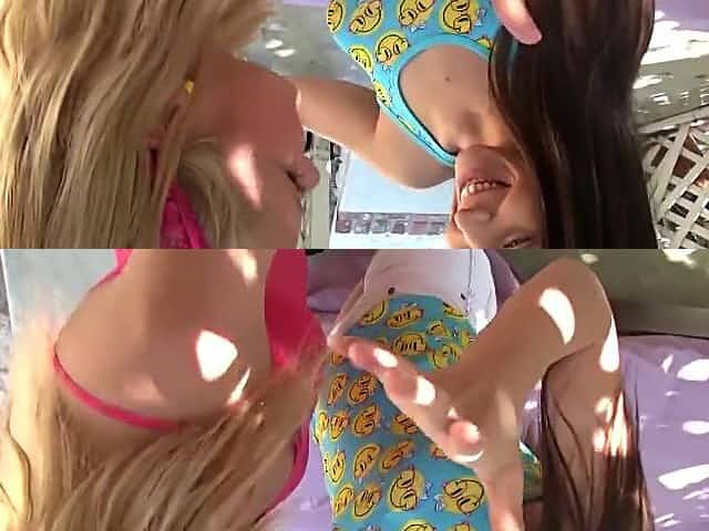 Little Taylor is playing with her brunette friend outdoors as lesbiasn