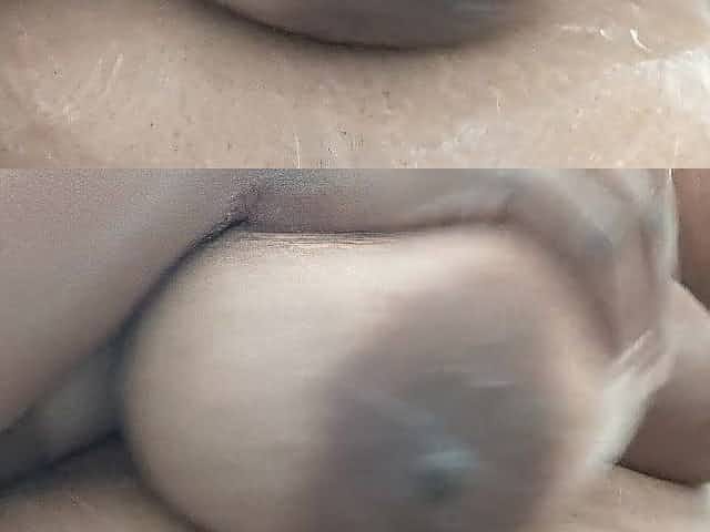 Rubbing lotion on Large Natural bazookas & hairless vagina