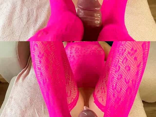 Footjob in Fishnet Pantyhose - Cum in a Condom and Smeared Cum on a Babe