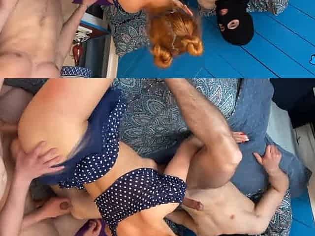???????? ????? ????????? ? ?????? - Horny Russian slut sucking four penises in orgy!