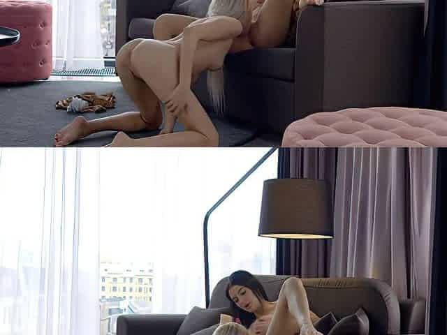 2 Russian lesbo beauties Sofilie and Kelly Collins making out on the couch