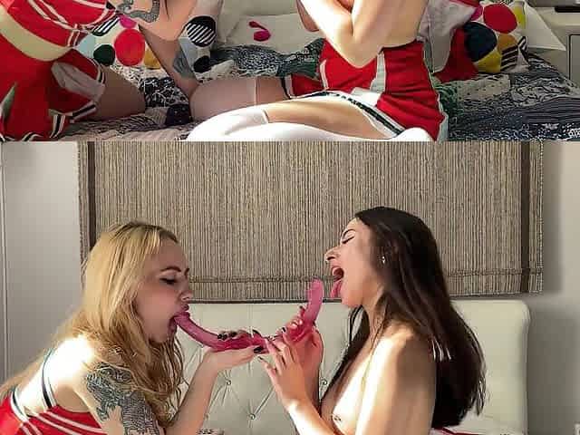 two lesbian cheerleaders fuck with a double dildo