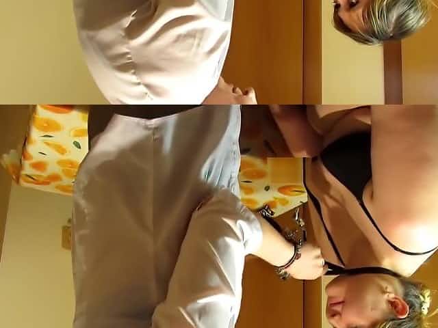 mature bbw lesbian girlfriends with a strap-on in the kitchen. POV