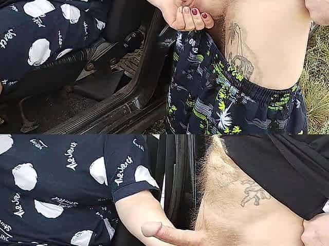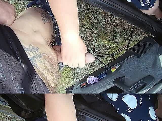 the floozy sits in the car and jerks off my cock in nature until I cum