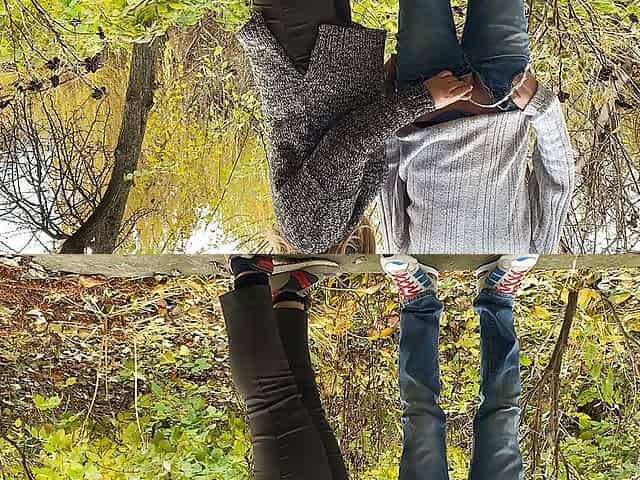 Horny MILF rubs her pussy in nature leaning against a tree.