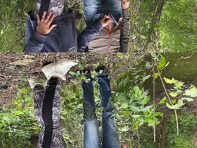 Chubby kinky milf in ripped tights rubs her pussy near the river.