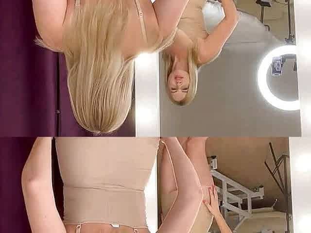 Curvy MILF masturbates her pussy in panties in a mall fitting room.