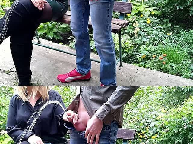 MILF gives golden shower after helping man pee outside