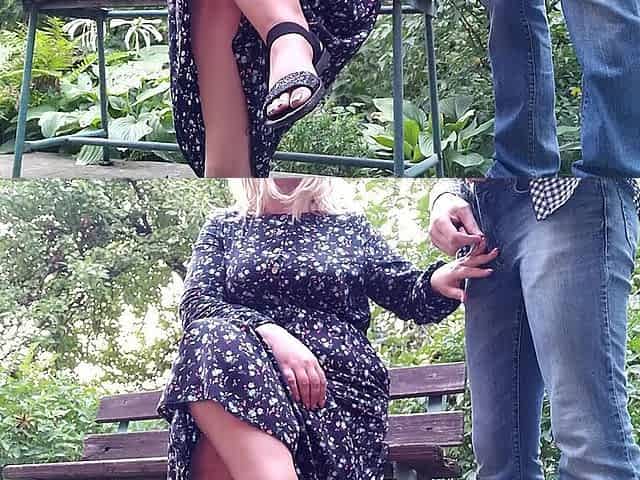 Luxurious stepmother helps her stepson to pee while sitting in the park on a bench