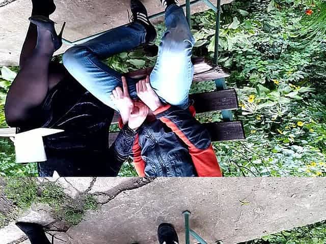 Sports mother-in-law after jogging in the park holds son-in-law's dick bottom view