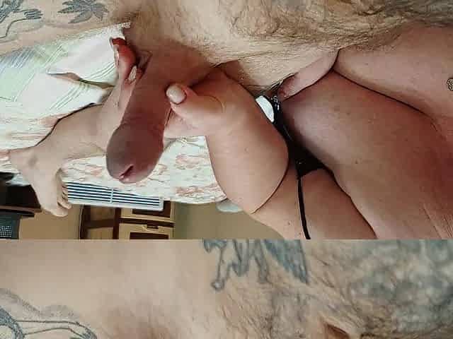 I'm sitting on the kitchen table and my mother-in-law masturbates my dong to me