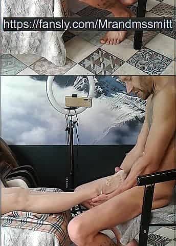 Russian doxy groans from climax and strong ejaculation on her legs in nylons