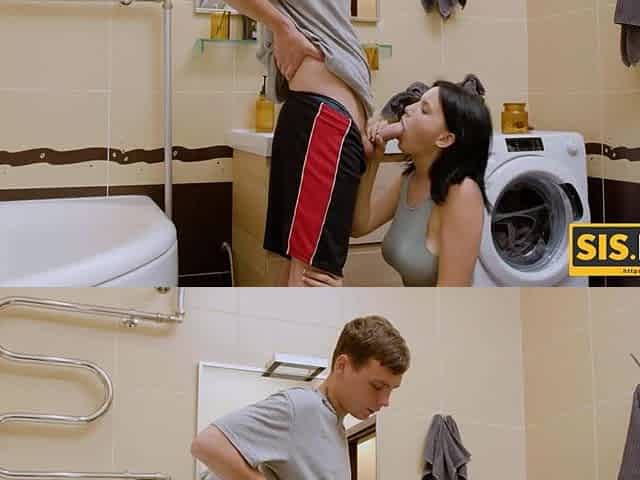 Horny brunette girl Queenlin is penetrated by her own stepbrother - European couple fucking in bathroom