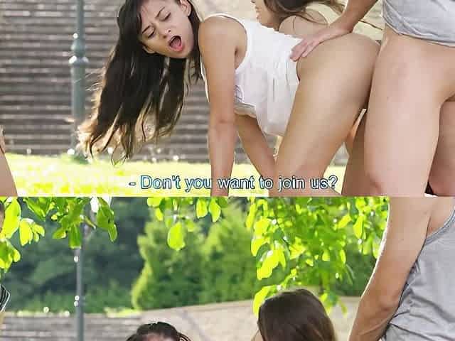 Lovely teen babes are sharing dude's cock out in the open
