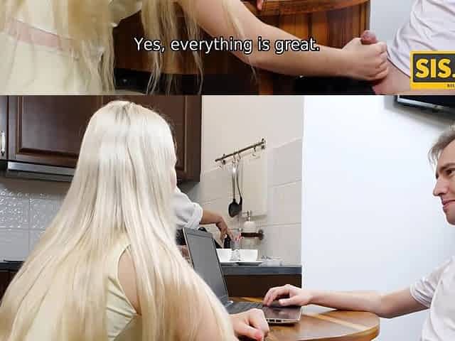 Naughty teen gal takes hard cunny pounding from her stepbro in the kitchen