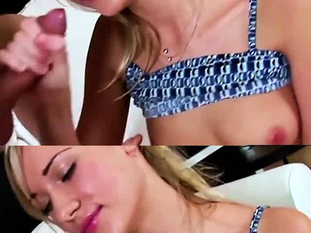 "Cute college girl in round glasses got a facial and hair cumshot"