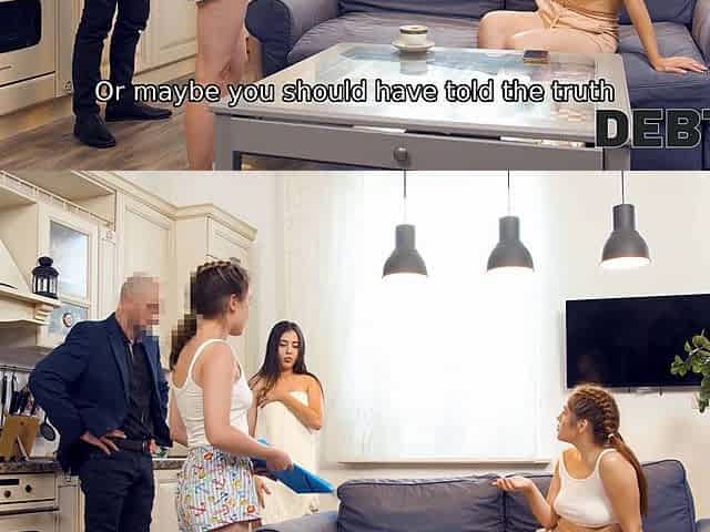 DEBT4k. Gal and her sexy roommates enjoy group sex with bank employee