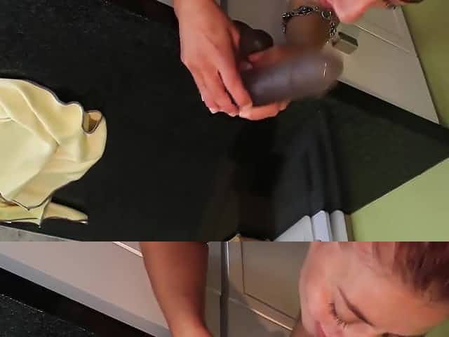 Busty babe in high heels Dominno masturbate in the kitchen with dildo
