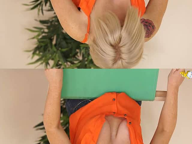 Tattooed proprietress of saggy tits gives her head