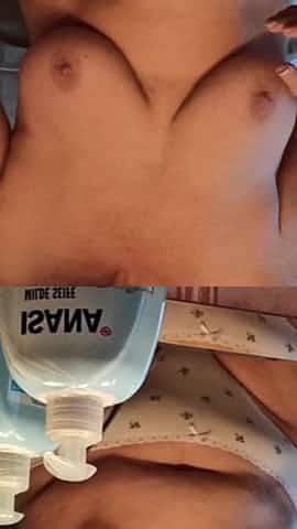 Oiling her dripping hot pussy and saggy hanging boobs