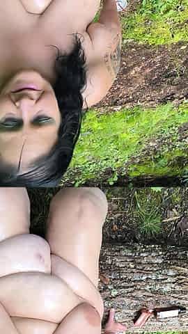 Touching her youthful and saggy boobs and twat in front of people outdoor